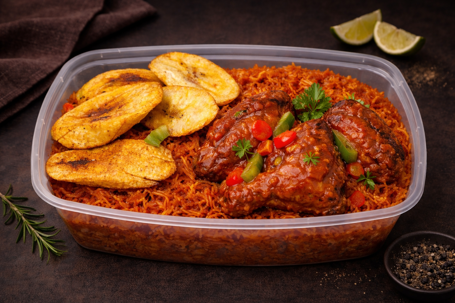 Jollof rice, plantain with sauced turkey